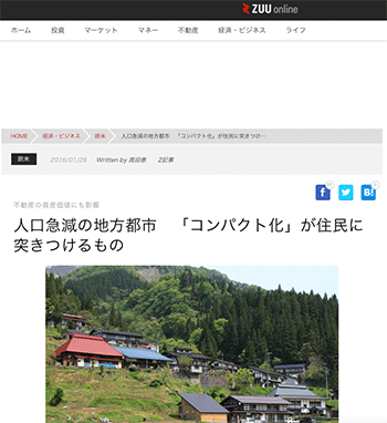 「人口急減の地方都市 「コンパクト化」が住民に突きつけるもの」という記事が、ZUU onlineに掲載されています。