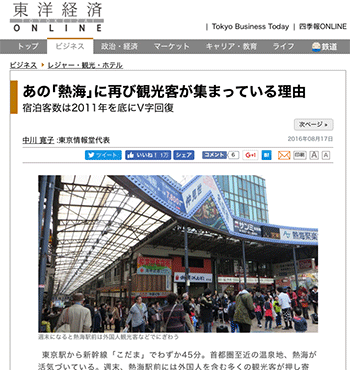 「あの「熱海」に再び観光客が集まっている理由 宿泊客数は2011年を底にV字回復」という記事が、東洋経済オンライン に掲載されています。