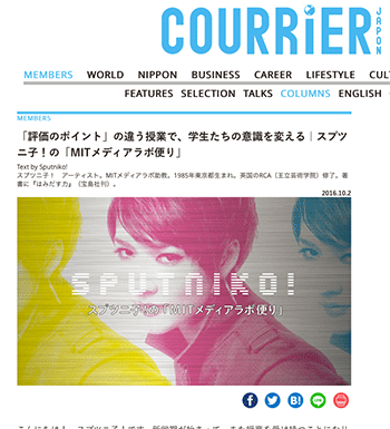 スプツニ子!氏による記事「「評価のポイント」の違う授業で、学生たちの意識を変える|スプツニ子!の「MITメディアラボ便り」」が、クーリエ・ジャポンに掲載されています。