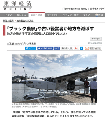 「ブラック農家」や古い経営者が地方を滅ぼす /地方の働き手不足の原因は人口減少ではない / 木下斉 (東洋経済オンライン) 「「ブラック農家」や古い経営者が地方を滅ぼす 」という木下斉氏による記事が東洋経済オンラインに掲載されています。 →『「ブラック農家」や古い経営者が地方を滅ぼす』 http://toyokeizai.net/articles/-/151881