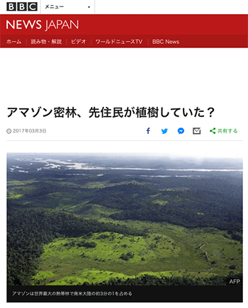 アマゾン密林、先住民が植樹していた? (BBCニュース) 「アマゾン密林、先住民が植樹していた?」という記事が、BBCニュースに掲載されています。 →『アマゾン密林、先住民が植樹していた?』 http://www.bbc.com/japanese/39150071