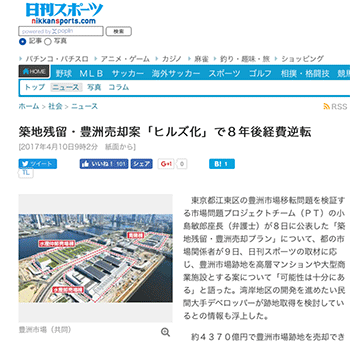 「築地残留・豊洲売却案「ヒルズ化」で8年後経費逆転」という豊洲市場問題に関するニュースを取り上げている記事が、日刊スポーツに掲載されています。