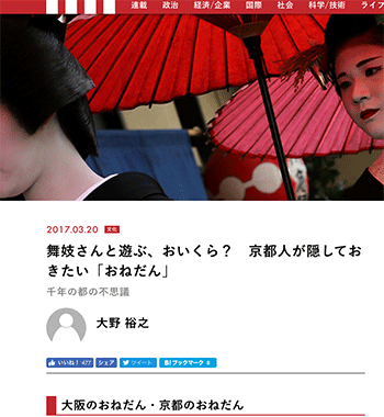 「舞妓さんと遊ぶ、おいくら? 京都人が隠しておきたい「おねだん」」という『京都のおねだん』の著者である大野裕之氏による記事が、現代ビジネスに掲載されています。