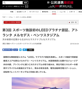 「スポーツ施設初のLEEDプラチナ認証、アトランタ メルセデス・ベンツスタジアム」というアメリカのアトランタでの取り組みについて取り上げている記事が新・公民連携最前線|PPPまちづくりに掲載されています。