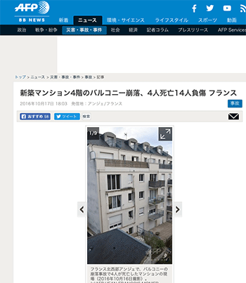フランス西部アンジェ(Angers)で先月、新築マンションの4階のバルコニーが崩落し、死傷がでる事故が起こっていたそうです。