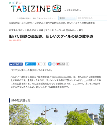 フランス、パリのバスティーユ駅から始まる「緑の散歩道 /Promenade plantée」を紹介している記事が、TABIZINEに掲載されています。