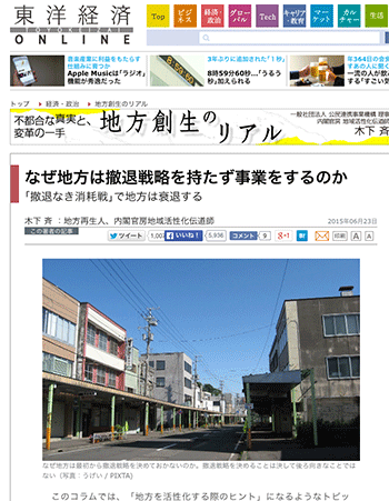 木下斉氏(地方再生人、内閣官房地域活性化伝道師)による記事「なぜ地方は撤退戦略を持たず事業をするのか 「撤退なき消耗戦」で地方は衰退する」が、東洋経済オンラインに掲載されています。