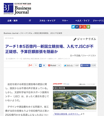 「アーチ1本5百億円…新国立競技場、入札でJSCが不正疑惑、予算巨額膨張を隠蔽か」というジャーナリストの平沼健氏による新国立競技場問題に関する記事が、ビジネスジャーナルに掲載されています。