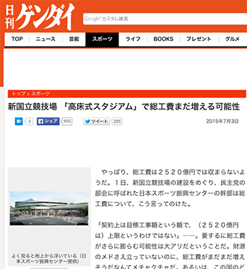新国立競技場問題に関する記事「新国立競技場 「高床式スタジアム」で総工費まだ増える可能性」が、日刊ゲンダイに掲載されています。