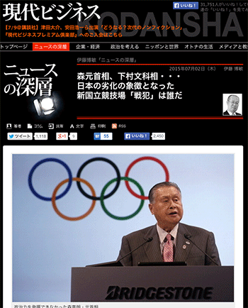 ジャーナリストの伊藤博敏氏による新国立競技場問題にに関する記事「森元首相、下村文科相・・・日本の劣化の象徴となった新国立競技場「戦犯」は誰だ」が、現代ビジネスに掲載されています。