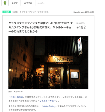 →『クラウドファンディングが可能にした”自由”とは? ナカムラケンタさん&小野裕之に聞く、リトルトーキョーのこれまでとこれから』