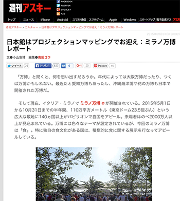 「日本館はプロジェクションマッピングでお迎え:ミラノ万博レポート」という、現在、イタリア、ミラノで開催されているミラノ万博に関する記事が、週刊アスキーに掲載されています。