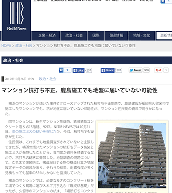 「マンション杭打ち不正、鹿島施工でも地盤に届いていない可能性」という福岡県久留米市のマンションについて取り上げている記事が、NETIB-NEWSに掲載されています。