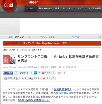 「サンフランシスコ市、「Airbnb」に制限を課す条例案を否決」という記事が、CNET Japanに掲載されています。
