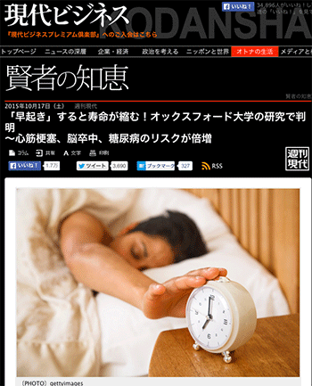 「「早起き」すると寿命が縮む!オックスフォード大学の研究で判明」という記事が、現代ビジネスに掲載されています。