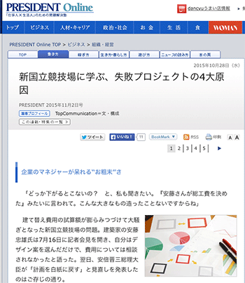 「新国立競技場に学ぶ、失敗プロジェクトの4大原因」というPRESIDENT 2015年11月2日号に掲載されたという、新国立競技場の問題に関する記事が、PRESIDENT Onlineに掲載されています。