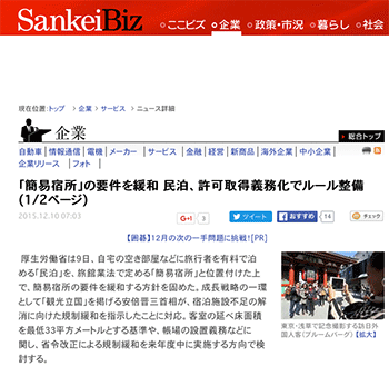 「「簡易宿所」の要件を緩和 民泊、許可取得義務化でルール整備」という民泊に関する記事が、SankeiBizに掲載されています。