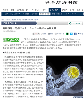 「睡眠不足は万病のもと たった一晩でも油断大敵 」という記事が、日本経済新聞に掲載されています。