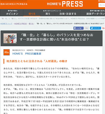 京都移住計画のメンバーである岸本千佳さんに話を聞いている記事が、HOME’S PRESSに掲載されています。