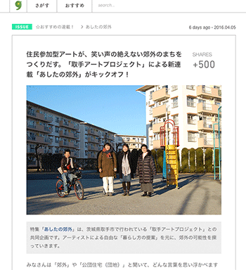 「住民参加型アートが、笑い声の絶えない郊外のまちをつくりだす。「取手アートプロジェクト」による新連載「あしたの郊外」がキックオフ!」という記事が、グリーンズに掲載されています。