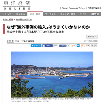 木下斉(まちビジネス事業家)氏による記事「なぜ「海外事例の輸入」はうまくいかないのか 行政が主導する「日本型○○」の不都合な真実」が、東洋経済オンラインに掲載されています。