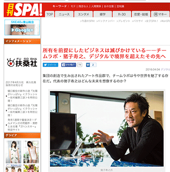 チームラボの猪子寿之氏へのインタビュー記事「所有を前提にしたビジネスは滅びかけている――チームラボ・猪子寿之、デジタルで境界を超えたその先へ」が、日刊SPA!に掲載されています。