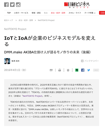 梅澤高明氏によるDMM.make AKIBAプロデューサーの小笠原治氏へのインタビュー記事「DMM.make AKIBA仕掛け人が語るモノ作りの未来」or「DMM.make AKIBA仕掛け人が語るモノ作りの未来」が、日経ビジネスオンラインに掲載されています。