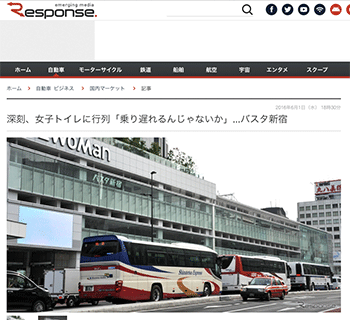 「深刻、女子トイレに行列「乗り遅れるんじゃないか」…バスタ新宿」という、新宿駅のバスターミナル「バスタ新宿」のトイレ問題を取り上げている記事が、レスポンスに掲載されています。