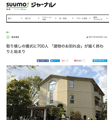 「取り壊しの儀式に700人 「建物のお別れ会」が描く終わりと始まり」という、埼玉県越谷市の朝日信用金庫研修所跡で開催された建物のお別れ会「棟下式」の模様を取材している記事が、スーモジャーナルに掲載されています。