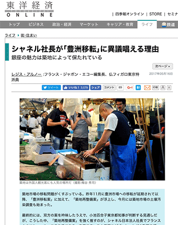 「シャネル社長が「豊洲移転」に異議唱える理由」という築地市場問題について取り上げている記事が、東洋経済オンラインに掲載されています。