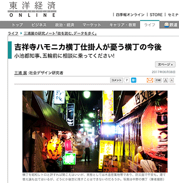 「吉祥寺ハモニカ横丁仕掛人が憂う横丁の今後」という三浦展氏による記事が、東洋経済オンラインに掲載されています。