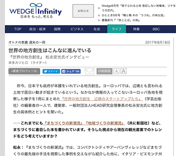 「世界の地方創生はこんなに進んでいる」という松永安光氏に地方創生について話をきいている記事が、WEDGE Infinityに掲載されています。
