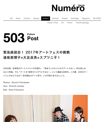 「緊急座談会! 2017年アートフェスの挑戦」という逢坂恵理子氏、大友良英氏、スプツニ子!氏による座談会の模様を伝えている記事が、Numero TOKYOに掲載されています。