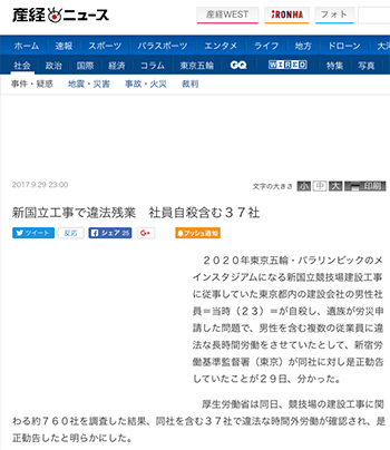 「新国立工事で違法残業 社員自殺含む37社」という記事が、産経ニュースに掲載されています。