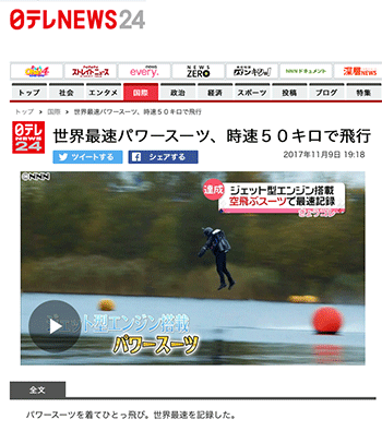 「世界最速パワースーツ、時速50キロで飛行 」という世界最速のパワースーツとして、今回ギネス世界記録に登録されたというイギリスでのニュースを取り上げている動画ニュースが、日テレNEWS24にて公開されています。