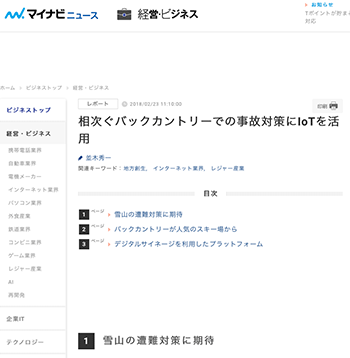 「相次ぐバックカントリーでの事故対策にIoTを活用」という記事が、マイナビニュースに掲載されています。