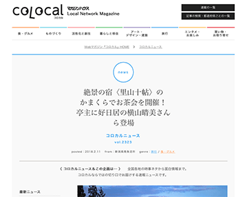「絶景の宿〈里山十帖〉のかまくらでお茶会を開催!亭主に好日居の横山晴美さんら登場 」という記事が、colocalに掲載されています。