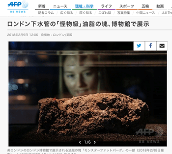 「ロンドン下水管の「怪物級」油脂の塊、博物館で展示」という記事が、AFPBB Newsに掲載されています。