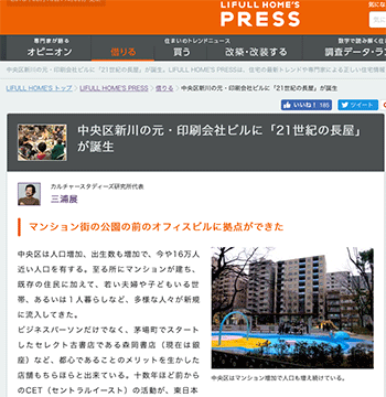 「中央区新川の元・印刷会社ビルに「21世紀の長屋」が誕生」という三浦展氏による記事が、LIFULL HOME’S PRESSに掲載されています。