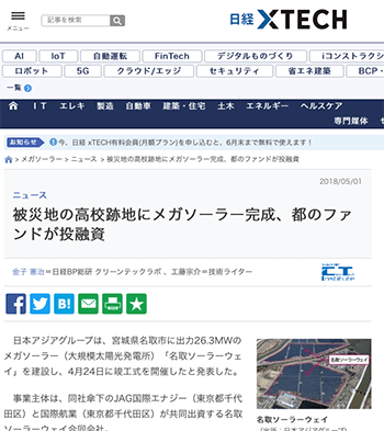 「被災地の高校跡地にメガソーラー完成、都のファンドが投融資」という宮城県名取市でのニュースを取り上げている記事が、日経 xTECH(クロステック)に掲載されています。
