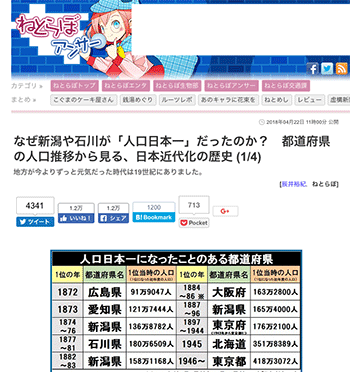 「なぜ新潟や石川が「人口日本一」だったのか? 都道府県の人口推移から見る、日本近代化の歴史」という記事が、ねとらぼに掲載されています。