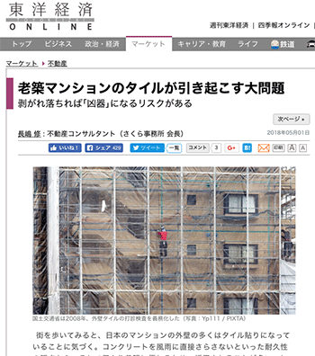 「老築マンションのタイルが引き起こす大問題」という記事が、東洋経済オンラインに掲載されています。