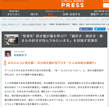 「“常滑系” 招き猫が福を呼ぶ!? 「猫好き・旅好き・焼きもの好きが住んでみたいまち」を目指す常滑市」という愛知県常滑市の事例を紹介している記事が、LIFULL HOME’S PRESSに掲載されています。
