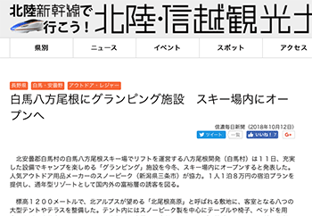 「白馬八方尾根にグランピング施設 スキー場内にオープンへ」という記事が、北陸・信越観光ナビに掲載されています。