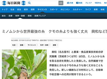 興和と農業・食品産業技術総合研究機構が開発した、ミノムシから糸を取る技術について取り上げている記事が、 毎日新聞に掲載されています。