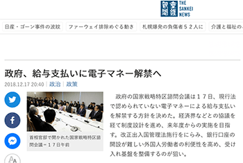 「政府、給与支払いに電子マネー解禁へ」という電子マネーによる給与支払いを解禁する政府方針について取り上げている記事が、産経ニュースに掲載されています。
