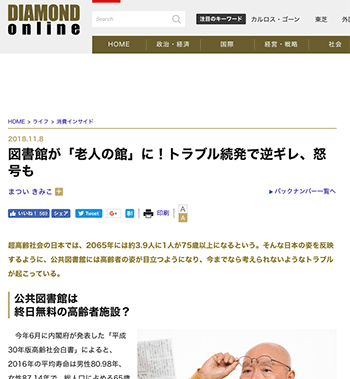 「図書館が「老人の館」に!トラブル続発で逆ギレ、怒号も」という記事が、 ダイヤモンド・オンラインに掲載されています。