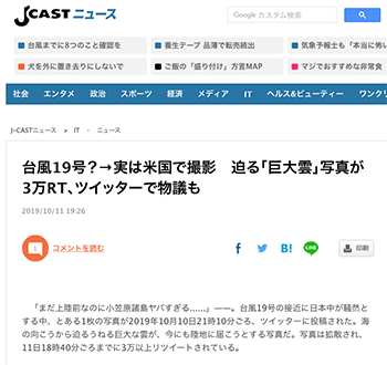 「台風19号?→実は米国で撮影 迫る「巨大雲」写真が3万RT、ツイッターで物議も」という記事が、J-CASTニュースに掲載されています。